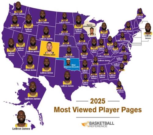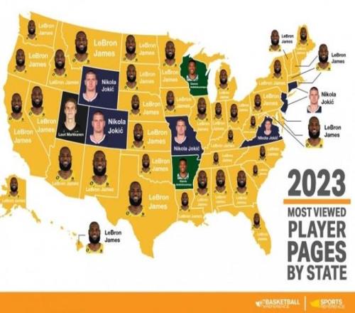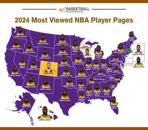 图片显示, BBR2024年美国各州被浏览次数最多的NBA球员也是詹姆斯,没被詹姆斯“占领”的州只有科罗拉多州(约基奇)、威斯康星州(字母哥)和马萨诸塞州(塔图姆)。 再往前到2023年,詹姆斯在41个州处于领先地位,其他上榜球员还有约基奇、字母哥和马尔卡宁。